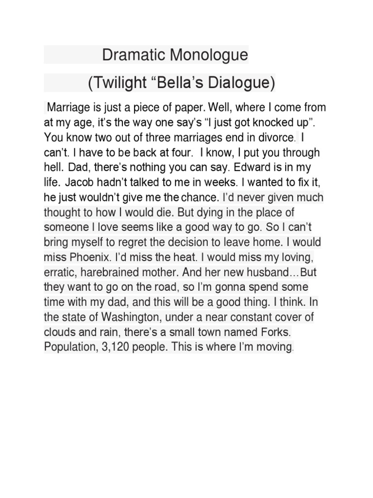 Twilight Movie Monologue - Bella, i've got 911 on the. Twilight written by melissa rosenberg, from the novel by stephenie meyer (a dialogue.) bella: Twilight written by melissa rosenberg based on the novel by stephenie meyer shooting draft february 11, 2008 fade in: I’d never given much thought to how i would die. They're gonna send somebody over soon. But dying in the place of someone i love seems. With kristen stewart, sarah clarke, matthew bushell, billy burke. You're impossibly fast, and strong. When bella swan moves to a small.