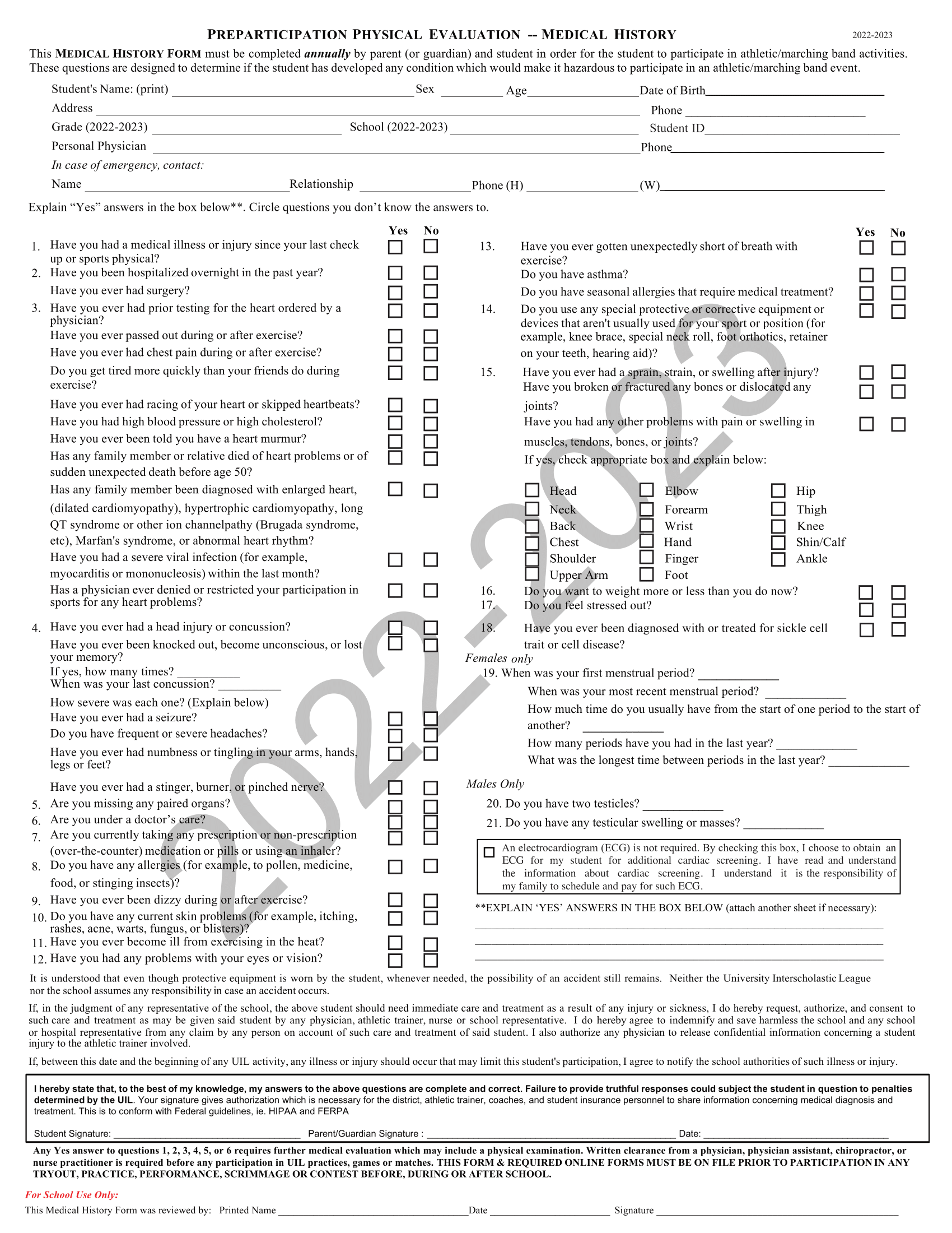 The university interscholastic league requires the preparticipation physical examination form prior to junior high athletic participation and again. Preparticipation physical evaluation history form (note: These links provide access to downloadable. This form is to be filled out by the patient and parent prior to seeing the physician. As a minimum requirement, this physical examination form must be completed prior to.