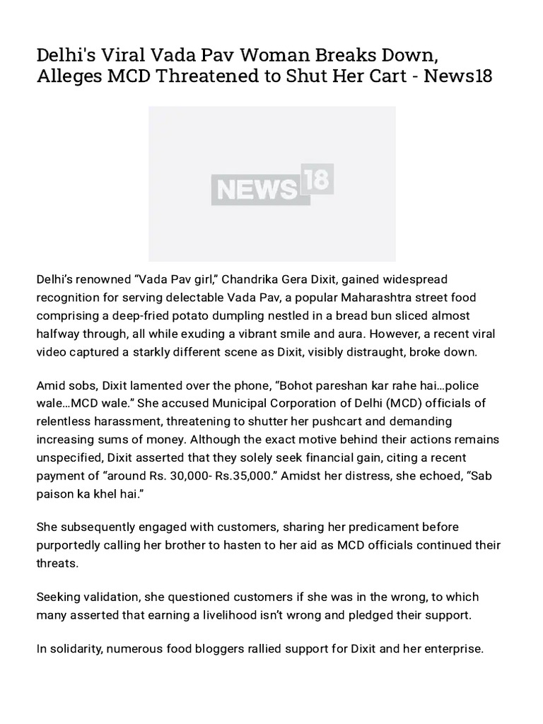 Delhi's Viral Vada Pav Woman Breaks Down, Alleges MCD Threatened PDF