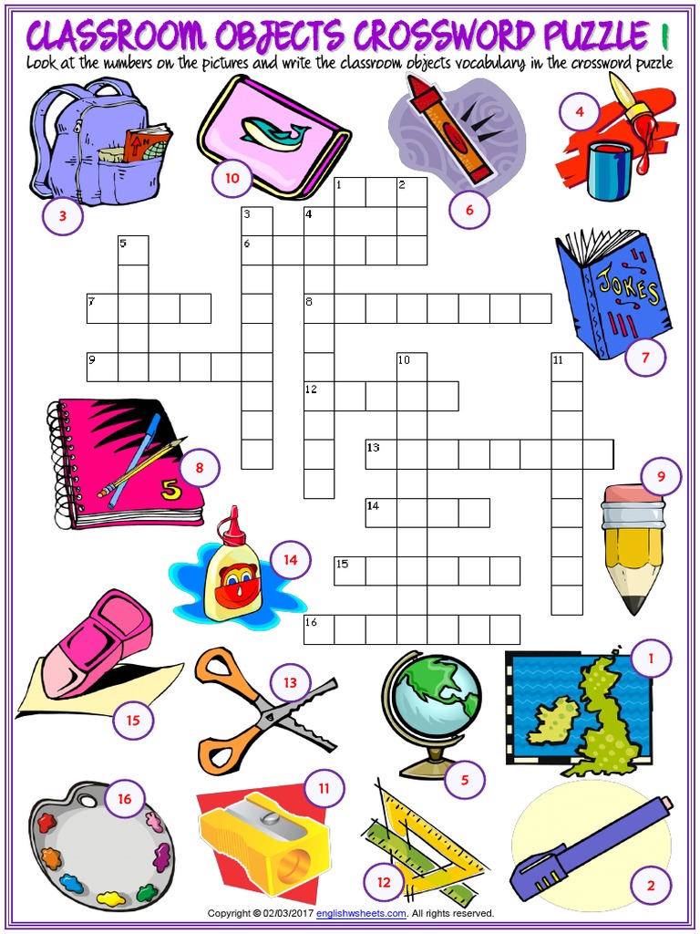 Classroom Objects Vocabulary Esl Crossword Puzzle Worksheet for Kids