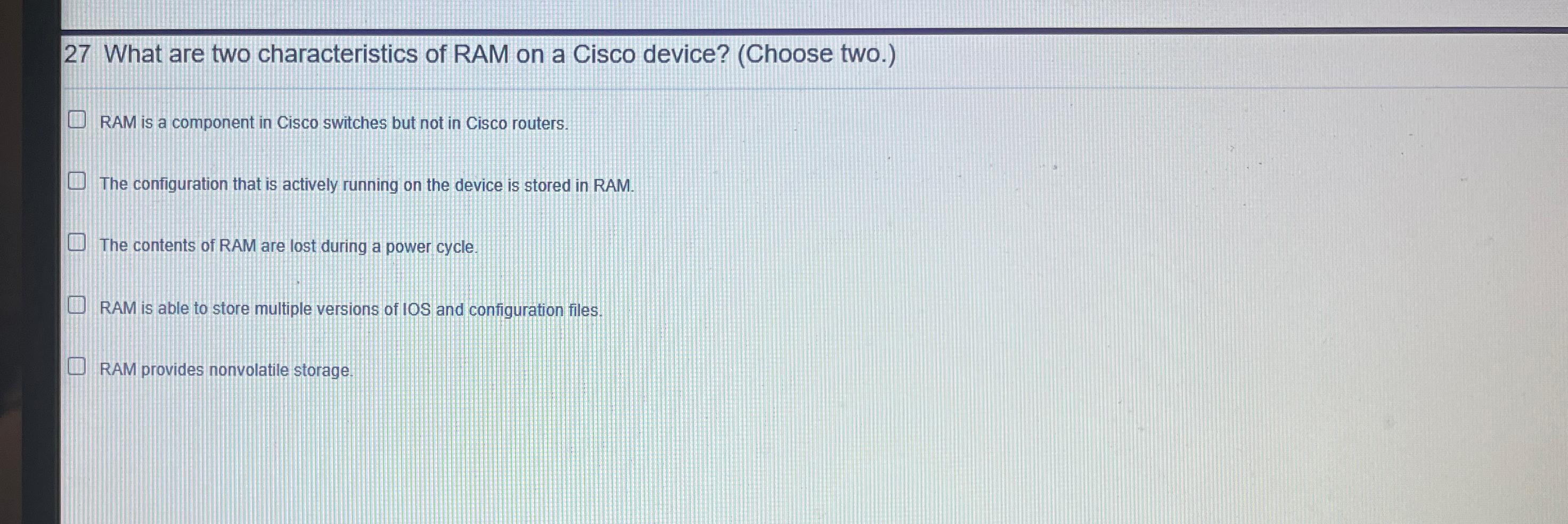 What are two characteristics of ram on a cisco device? What are two characteristics of ram on a cisco device? (choose two.) ram is able to store multiple versions of ios and configuration files. The configuration that is actively running.