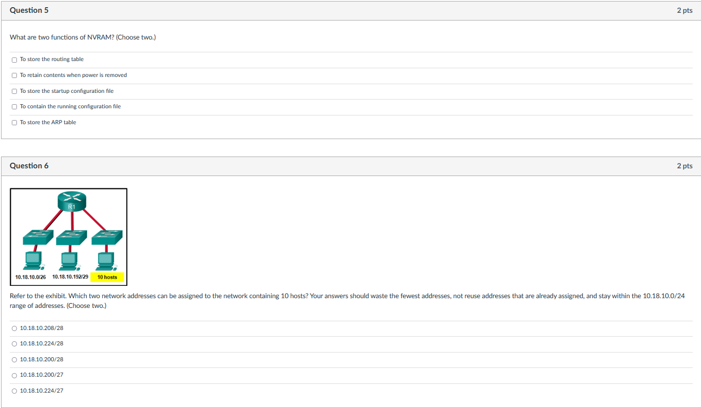 What are two functions of nvram? Which of the following are functions of nvram? To store the startup configuration file; A network administrator is connecting a new host to the service lan. Study with quizlet and memorize flashcards containing terms like refer to the exhibit.