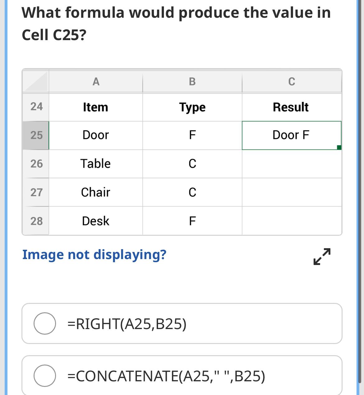 The formula you provided, =concatenate (a25, , b25), is the correct. Based on our analysis, the formula that would produce the value in cell c25 is:. This formula combines the value in a25 (door) and. One common formula that could be placed in cell c25 is: This formula sums up all. To produce the value in cell c25, which is door f, you can use the following.