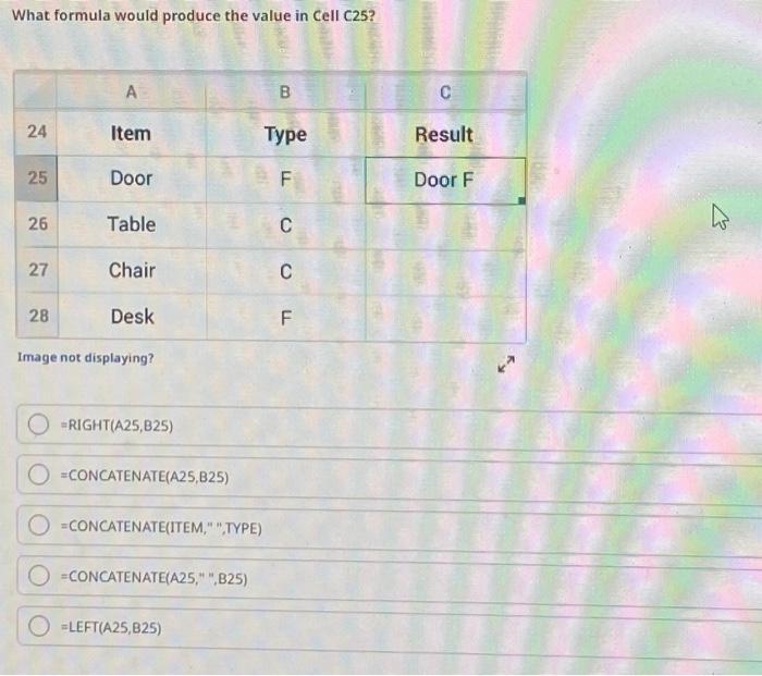 This formula combines the value in a25 (door) and. The formula you provided, =concatenate (a25, , b25), is the correct. To produce the value in cell c25, which is door f, you can use the following. This formula sums up all. Based on our analysis, the formula that would produce the value in cell c25 is:.