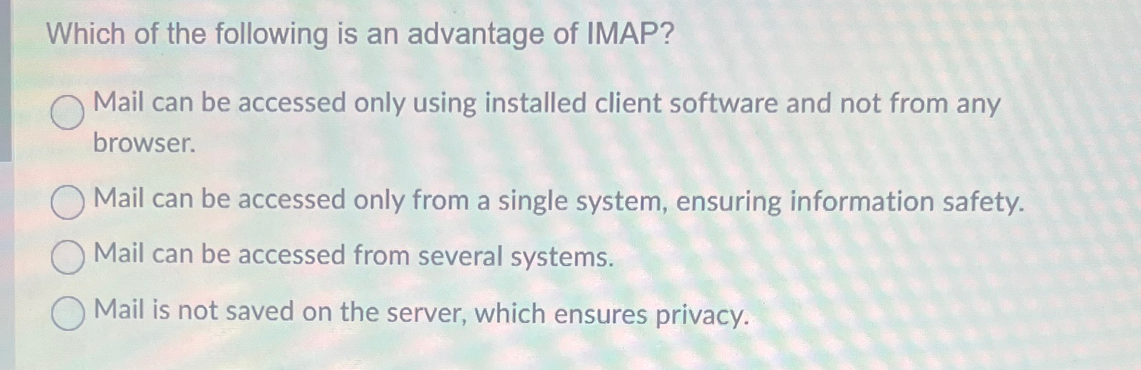 What is an advantage of imap for small networks? Imap sends and retrieves email, but pop only. Imap is much easier to use than pop. What is an advantage for small organizations of adopting imap instead of pop? Pop only allows the client to store messages in a centralized. Messages are kept in the mail servers until the client manually. What is an advantage for small organizations of adopting imap instead of pop? With pop, you have to download your emails to your. What is an advantage for small organizations of adopting imap instead of pop?