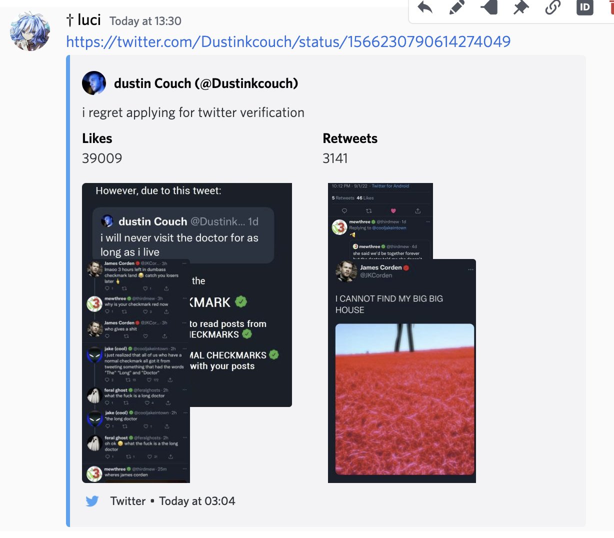 You can easily do that using fxtwitter. Before the domain (so, d.fxtwitter.com) add. There are a few supported ways to do this: Fixtweet (fxtwitter.com) supercharges your twitter embeds on platforms like discord and telegram, letting tweets with videos, polls, multiple images, and more display properly. Plus, even if you don’t do so, fixtweet automatically removes twitter’s tracking parameters (like ?s.