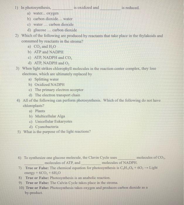 Solved 1) In photosynthesis, is oxidized and is reduced a)