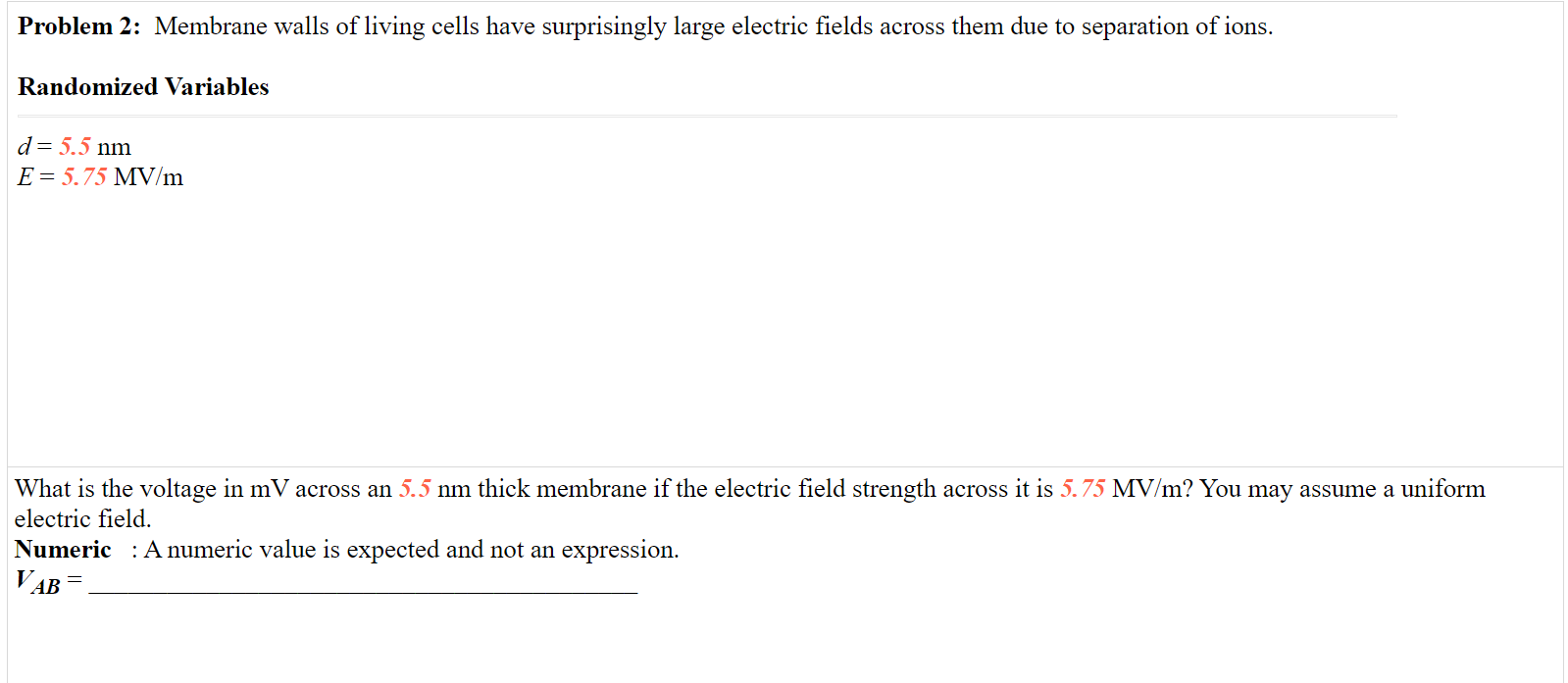 A cell membrane consists of an inner and outer wall separated by a distance of approximately 10nm10nm. What is the electric field between the membrane. The answers are 1) 1×10^6 n/c, 2) 2×10^13 n, 3) 6×10^3 v, 4) toward the inner wall. 1) the magnitude of the electric field between. A k+ ion (mass of 6.5×10−23 kg) is accelerated through.