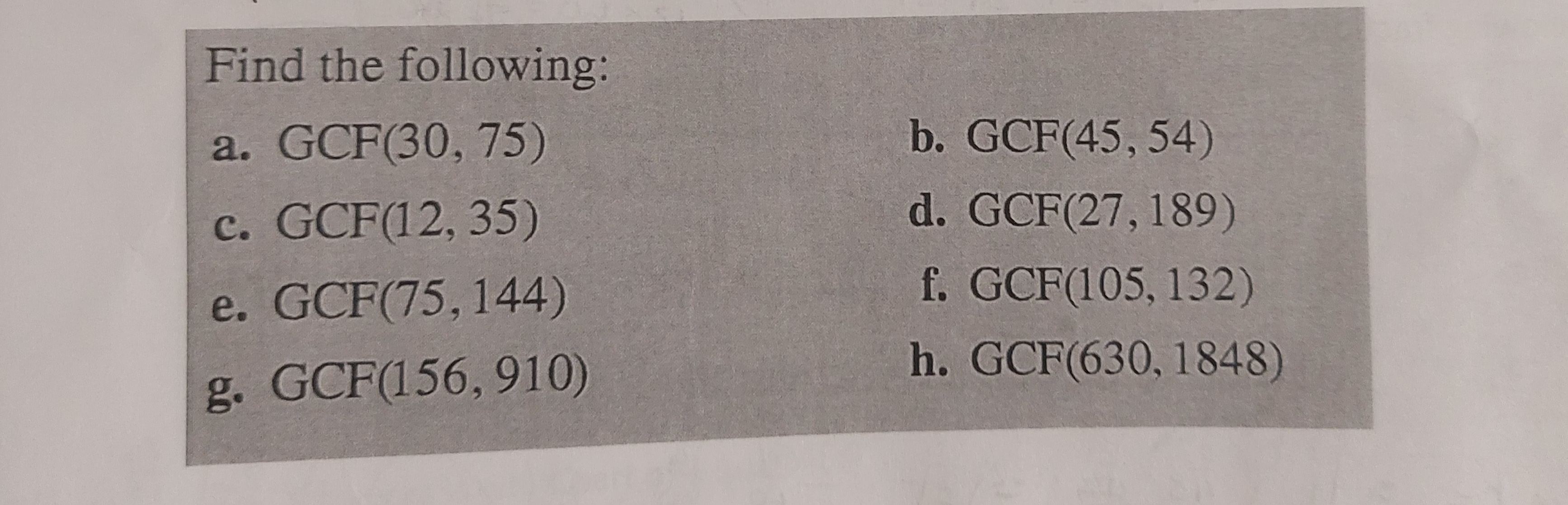 Solved Find the following a. GCF(30,75) b. GCF(45,54) c.