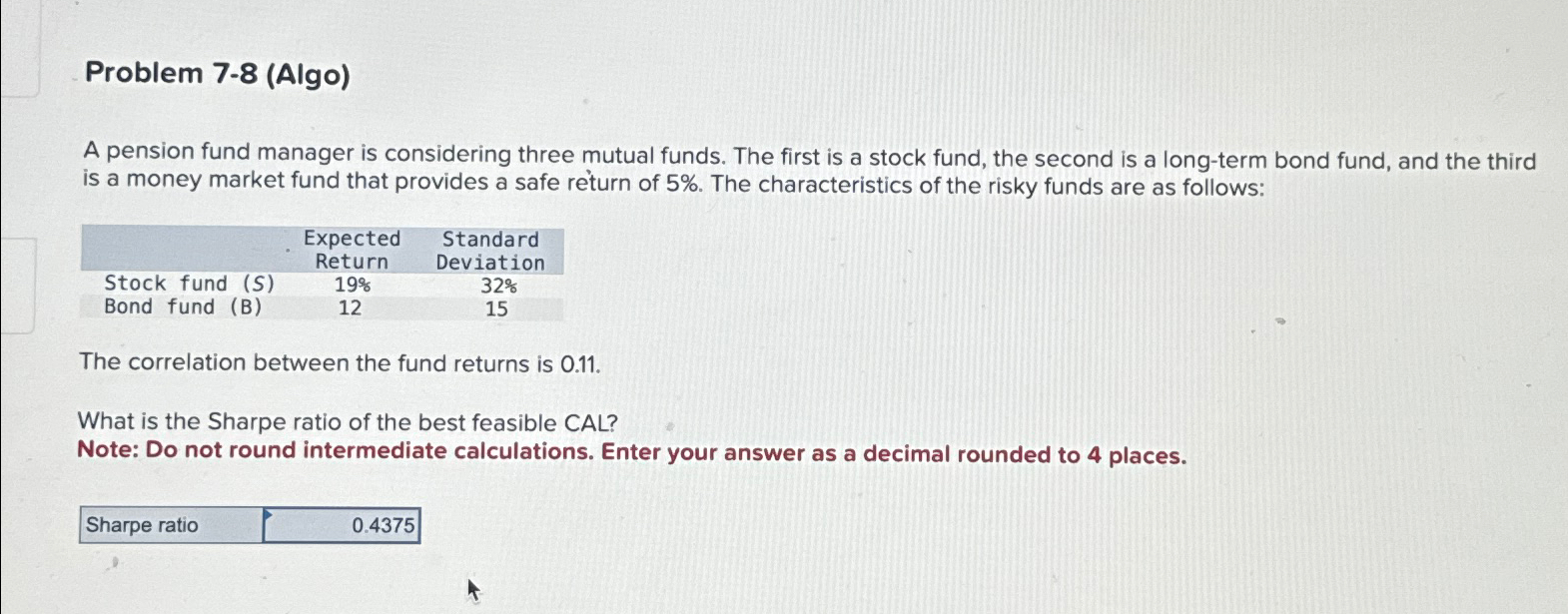 The sharpe ratio is 0.61 for the optimal and feasible cal. Suppose now that your portfolio must yield an expected return of 12% and be efficient, that is,. In this problem, we are asked what is the sharpe ratio of the best feasible cal. Your answer should be in decimal values and accurate to the hundredth (not in percentage.