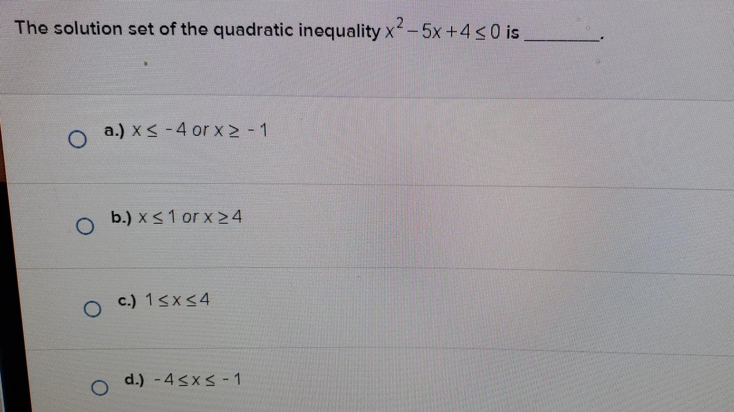 Solved The solution set of the quadratic inequality x25x+4