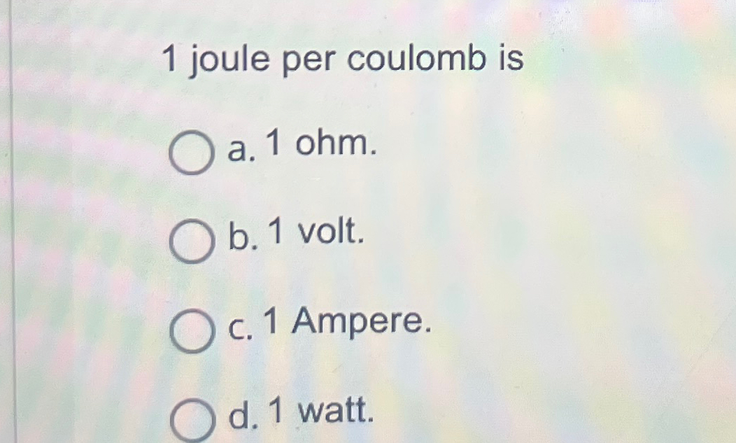 Solved 1 joule per coulomb isa. 1 ohm.b. 1 volt.c. 1
