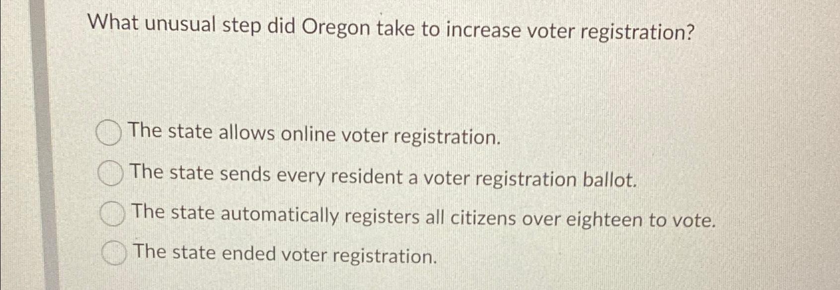 The state automatically registers all citizens over eighteen to vote. What unusual step did oregon take to increase voter registration? Oregon took the unusual step of implementing an automatic voter registration policy, known as the 'motor voter act', to. The state automatically registers all citizens over. The state automatically registers all citizens over eighteen to vote. What unusual step did oregon take to increase voter registration? What unusual step did oregon take to increase voter registration a.