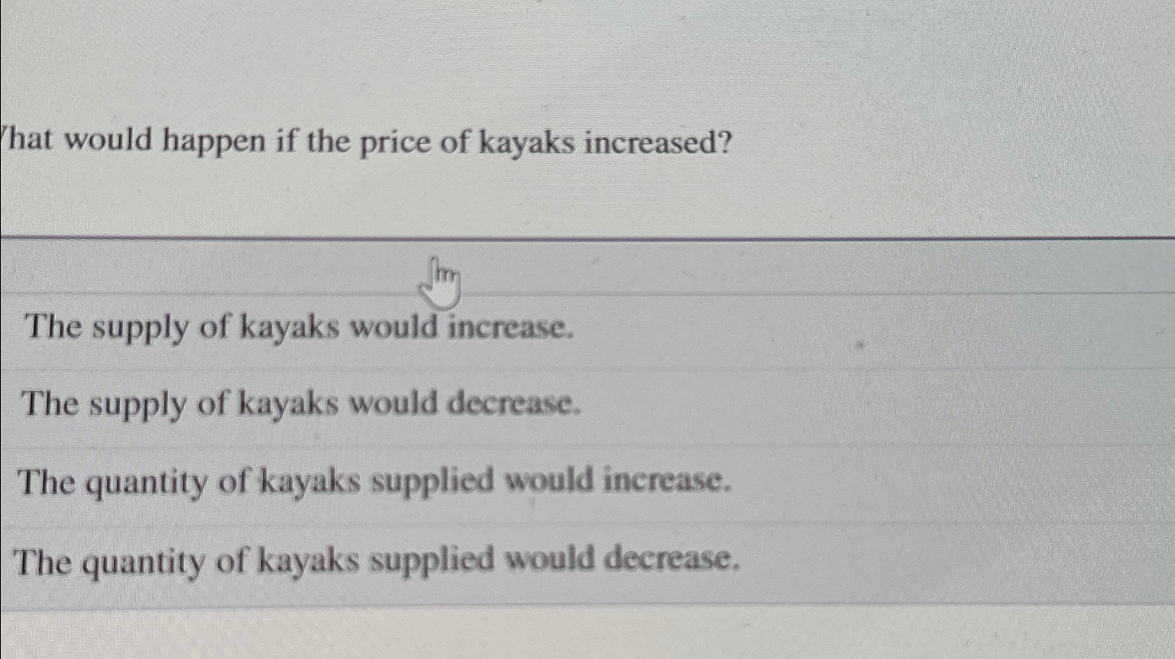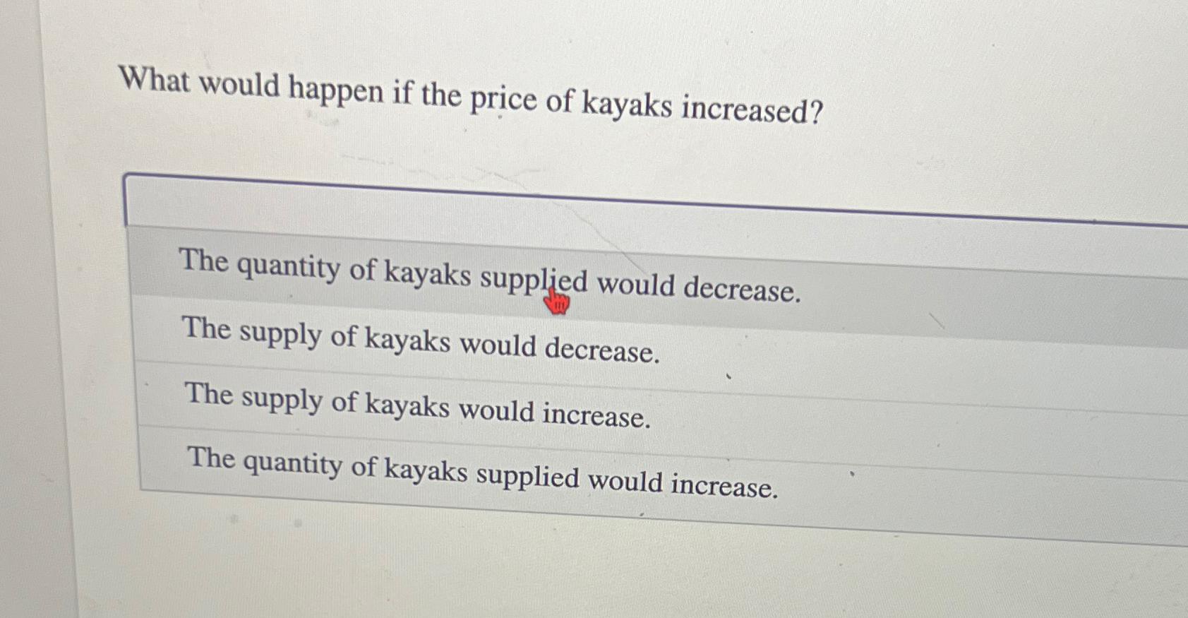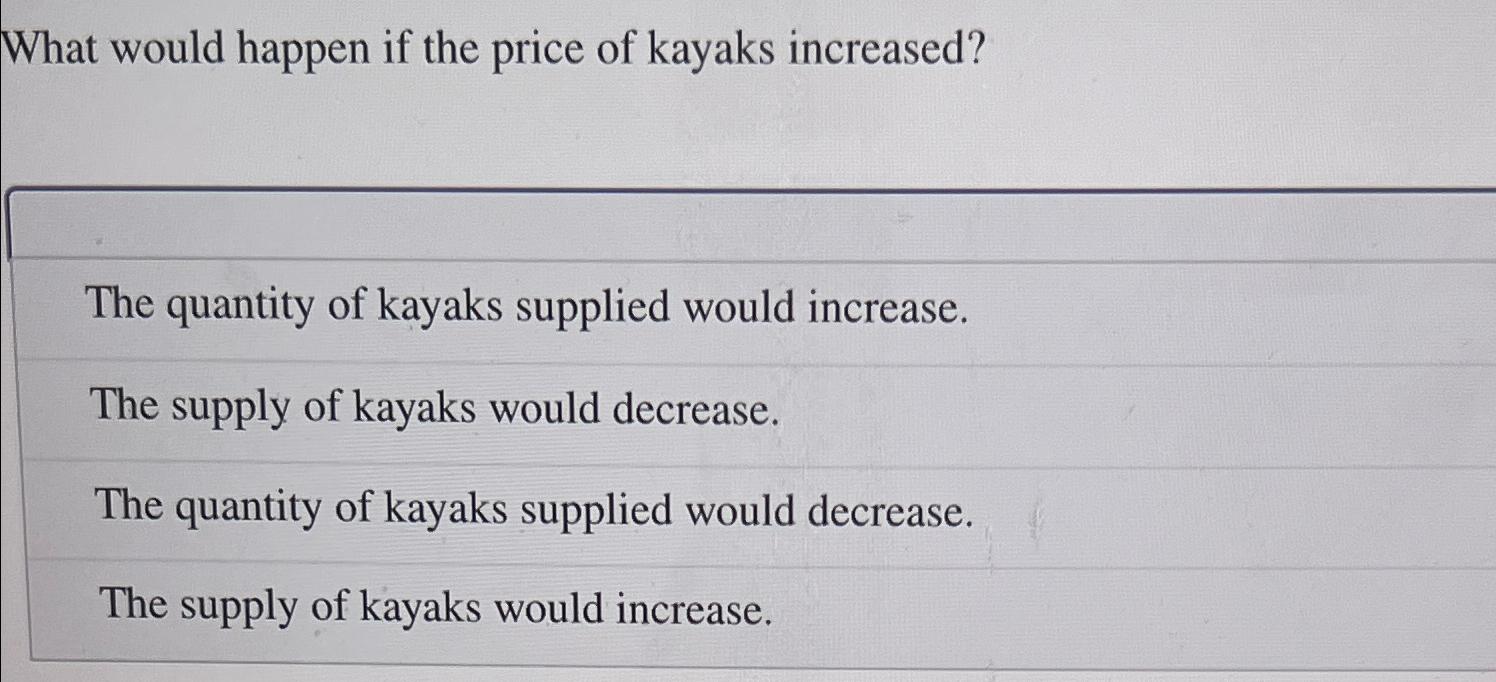 If the price of kayaks increased, the supply of kayaks would decrease, and sellers would offer fewer kayaks for sale. All you really need to know was right there on the board: An increase in the price of kayaks, assuming no other factors change, typically leads to an increase in the quantity of kayaks supplied. Increased demand for kayak substitutes:.