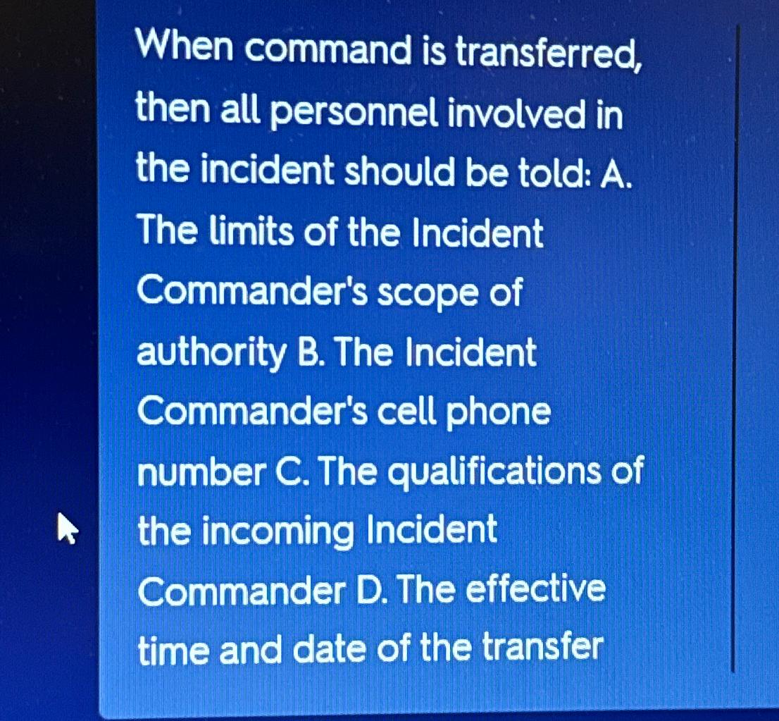When command is transferred, the process should include a(n): A) a meeting of all command and general staff to communicate tactical direction. Detailed lesson learned report d. When command is transferred, the process must include: Transfer of command is the process of moving the responsibility for incident command from one incident commander to another incident. When command is transferred, moving responsibility for incident command from one incident commander to another, the process. When command is transferred, the process should include a(n):