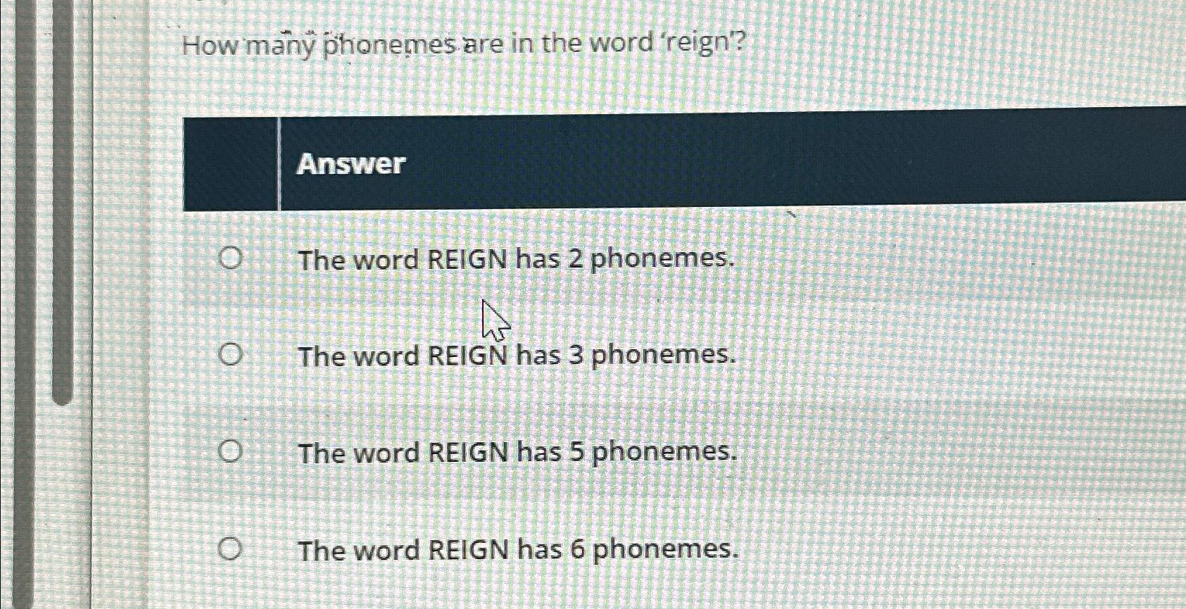 Solved How many phonemes are in the word 'reign'?AnswerThe