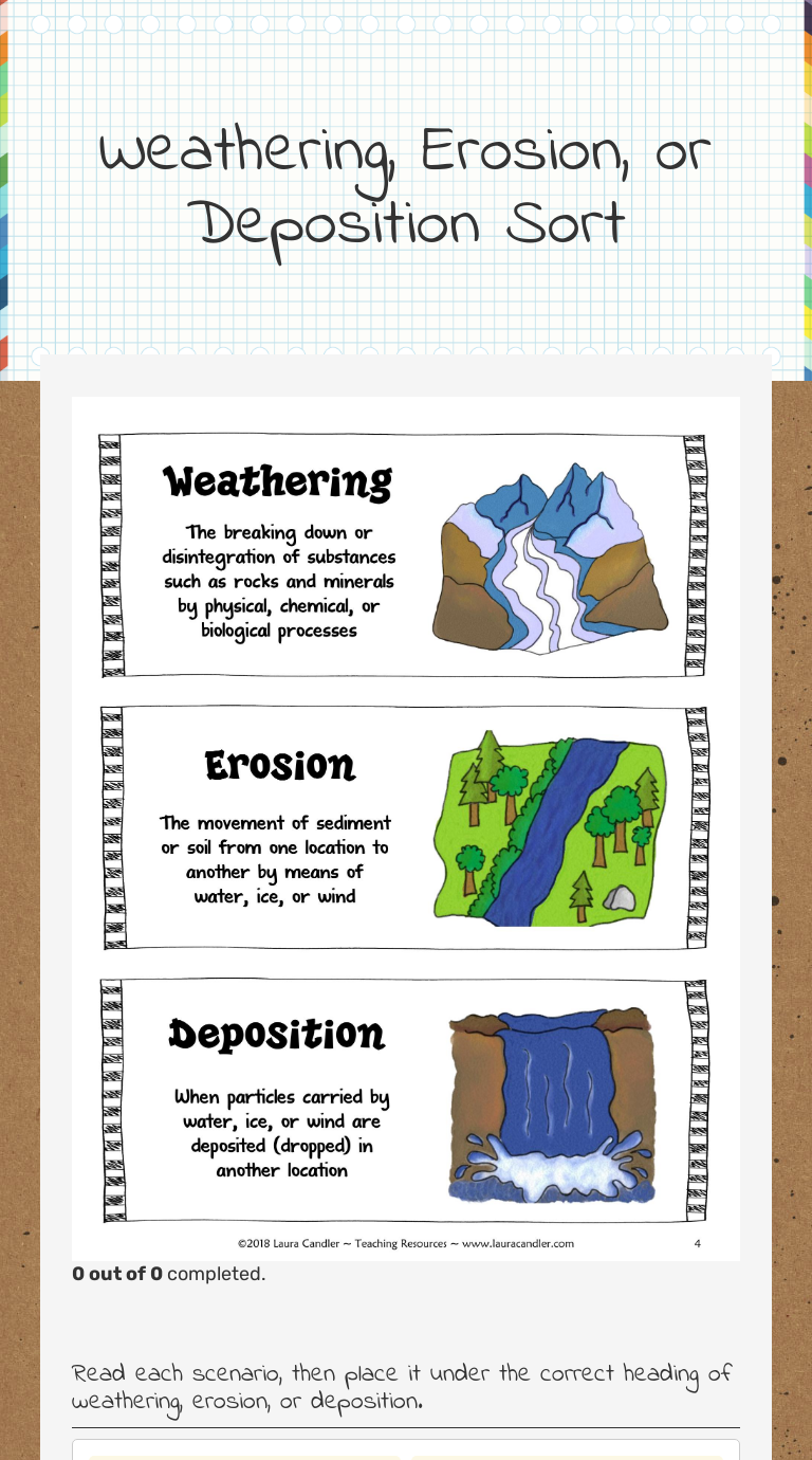The major result of heavy rains or. Identify whether weathering or erosion occurs in each of the following situations:. Our weathering erosion and deposition worksheet collection will help you easily learn about this. Use this weathering and erosion worksheet as an introductory lesson for deposition or as a. Review and discuss the meanings of weathering, erosion,.