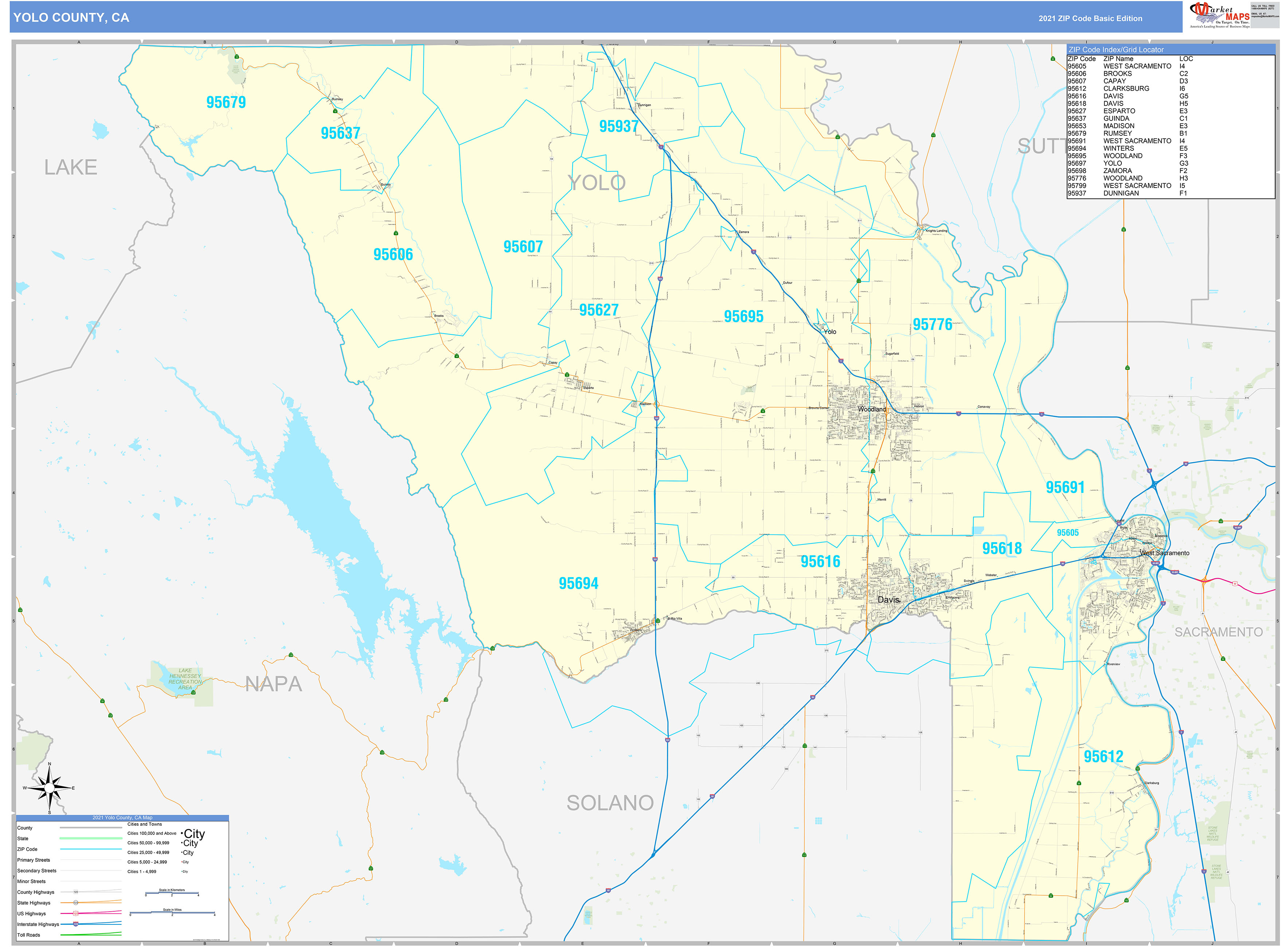 Yolo County, CA Zip Code Wall Map Basic Style by MarketMAPS MapSales